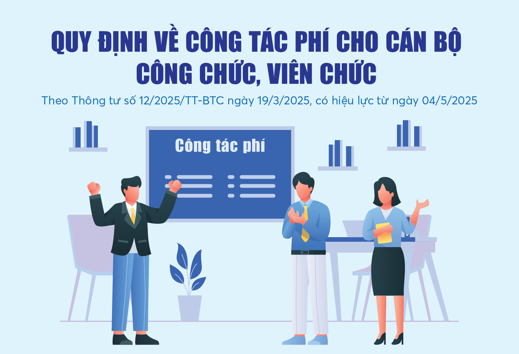 Infographics: Quy định mới về công tác phí cho cán bộ công chức, viên chức từ ngày 4/5/2025 (08/04/2025 15:08)Bộ Tài chính đã ban hành Thông tư 12/2025/TT-BTC ngày 19/3/2025 sửa đổi, bổ sung một số điều của Thông tư 40/2017/TT-BTC của Bộ trưởng Bộ Tài chính quy định chế độ công tác phí, chế độ chi hội nghị, có hiệu lực thi hành từ ngày 04/5/2025