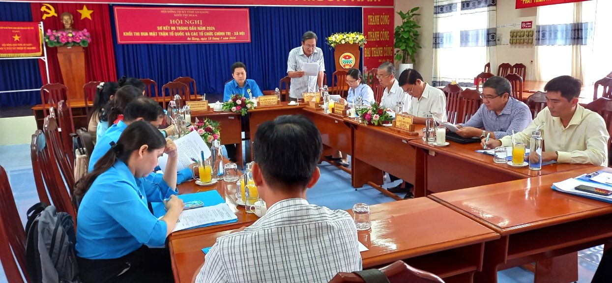 Khối thi đua Mặt trận Tổ quốc và các tổ chức chính trị - xã hội tỉnh An Giang: Sơ kết 6 tháng đầu năm 2024 (19/07/2024 09:22)Ngày 19/7, tại Hội Nông dân tỉnh An Giang, Khối thi đua Mặt trận Tổ quốc và các tổ chức chính trị - xã hội tỉnh An Giang tổ chức Hội nghị sơ kết 6 tháng đầu năm 2024.