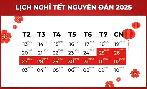 An Giang thông báo Về việc nghỉ Lễ, Tết năm 2025 (16/12/2024 16:18)Ngày 13/12, Ủy ban nhân dân tỉnh thông báo lịch nghỉ Lễ, Tết Nguyên đán Ất Tỵ năm 2025 đối với cán bộ, công chức, viên chức, người lao động làm việc trong các cơ quan hành chính, sự nghiệp, tổ chức chính trị, tổ chức chính trị - xã hội, các đơn vị trường học… và treo cờ Tổ quốc trên địa bàn tỉnh, như sau: