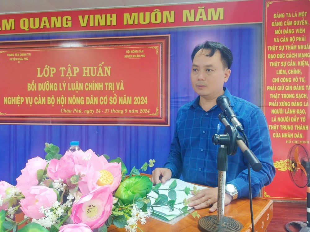 Công tác bồi dưỡng lý luận chính trị và nghiệp vụ cho cán hội cơ sở (26/09/2024 16:14)Vừa qua, tại Hội trường Trung tâm Chính trị Huyện ủy, Hội Nông dân huyện Châu Phú phối hợp Trung tâm Chính trị huyện tổ chức lớp tập huấn, bồi dưỡng lý luận chính trị và nghiệp vụ cán bộ Hội Nông dân cơ sở cho Lãnh đạo Hội Nông dân các xã, thị trấn; chi hội nông dân ở các ấp và chi, tổ hội nghề nghiệp nông dân trên địa bàn huyện.