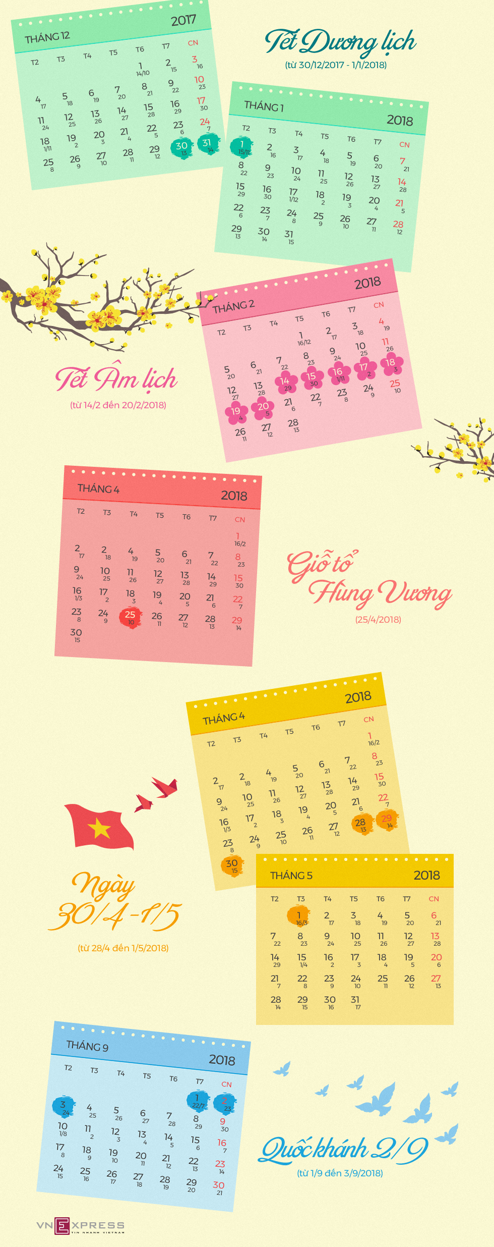 16 ngày nghỉ dịp lễ, Tết năm 2018 (09/01/2018)Cùng dịp nghỉ Tết Âm lịch 7 ngày, Thủ tướng đã duyệt số ngày nghỉ lễ khác trong năm 2018 như đề nghị của Bộ Lao động. -