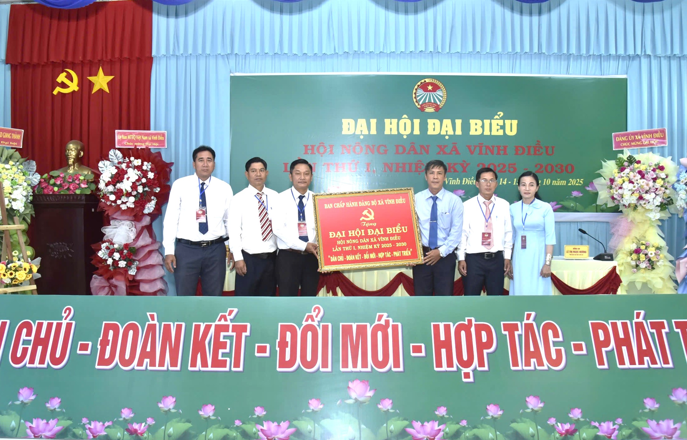 Phó Bí thư Thường trực Đảng ủy, Chủ tịch HĐND xã Vĩnh Điều Huỳnh Thiện Khoa (thứ ba, từ phải qua) trao tặng bức trướng cho đại hội.