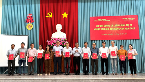 Bế giảng lớp bồi dưỡng lý luận chính trị và nghiệp vụ công tác nông vận năm 2023 (10/11/2023 15:55)Sáng ngày 10/11/2023, Hội Nông dân tỉnh phối hợp với trường Chính trị Tôn Đức Thắng tổ chức bế giảng lớp bồi dưỡng lý luận chính trị và nghiệp vụ công tác nông vận năm 2023.