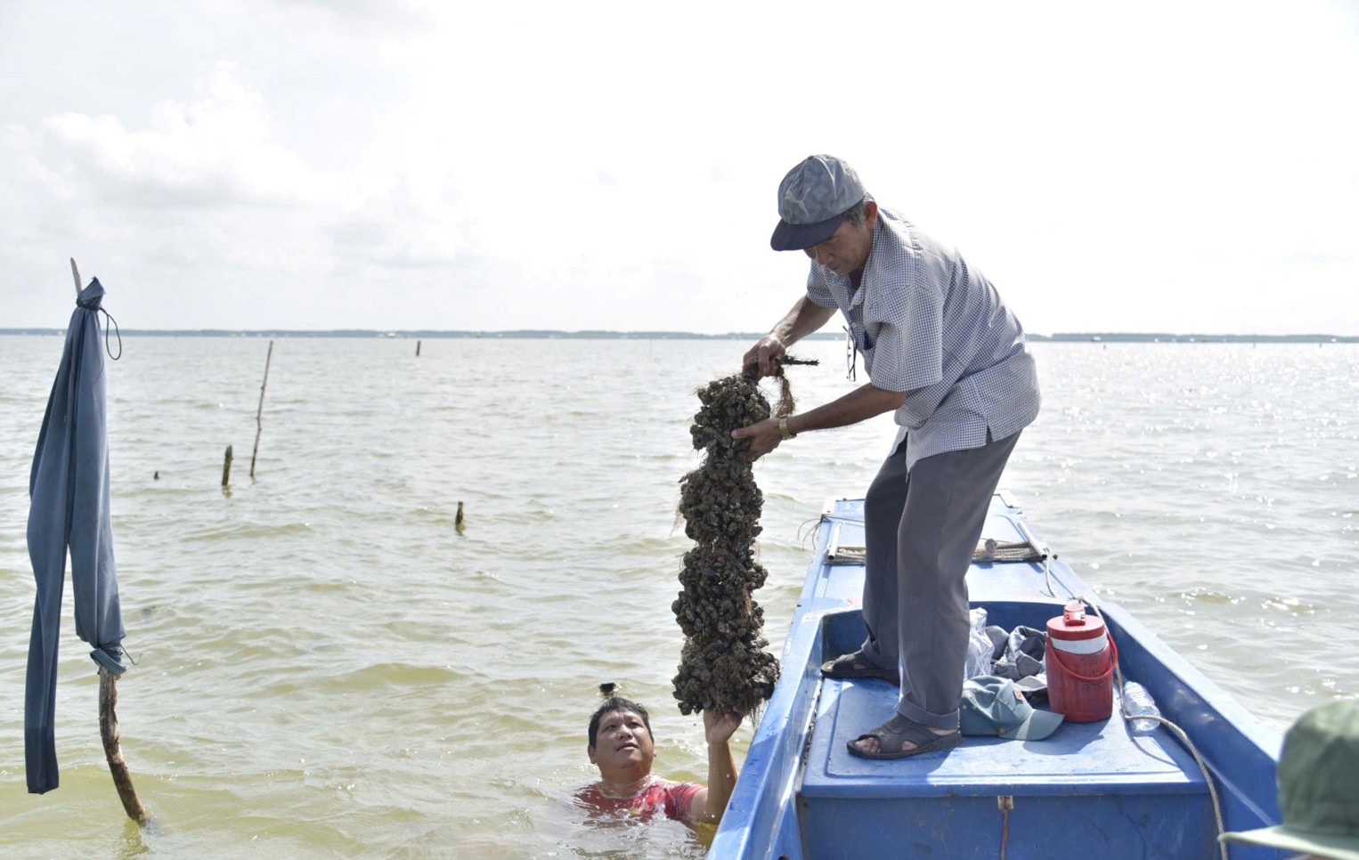 Theo chân ông Trăng xuống bãi, tôi mới cảm nhận hết sự vất vả của nghề. Nước biển ngập ngang ngực, sóng vỗ liên hồi, người nuôi phải vừa giữ thăng bằng, vừa khéo léo gỡ từng túi vẹm. Thế nhưng, giữa cái nhọc nhằn ấy lại ánh lên niềm vui rõ rệt.