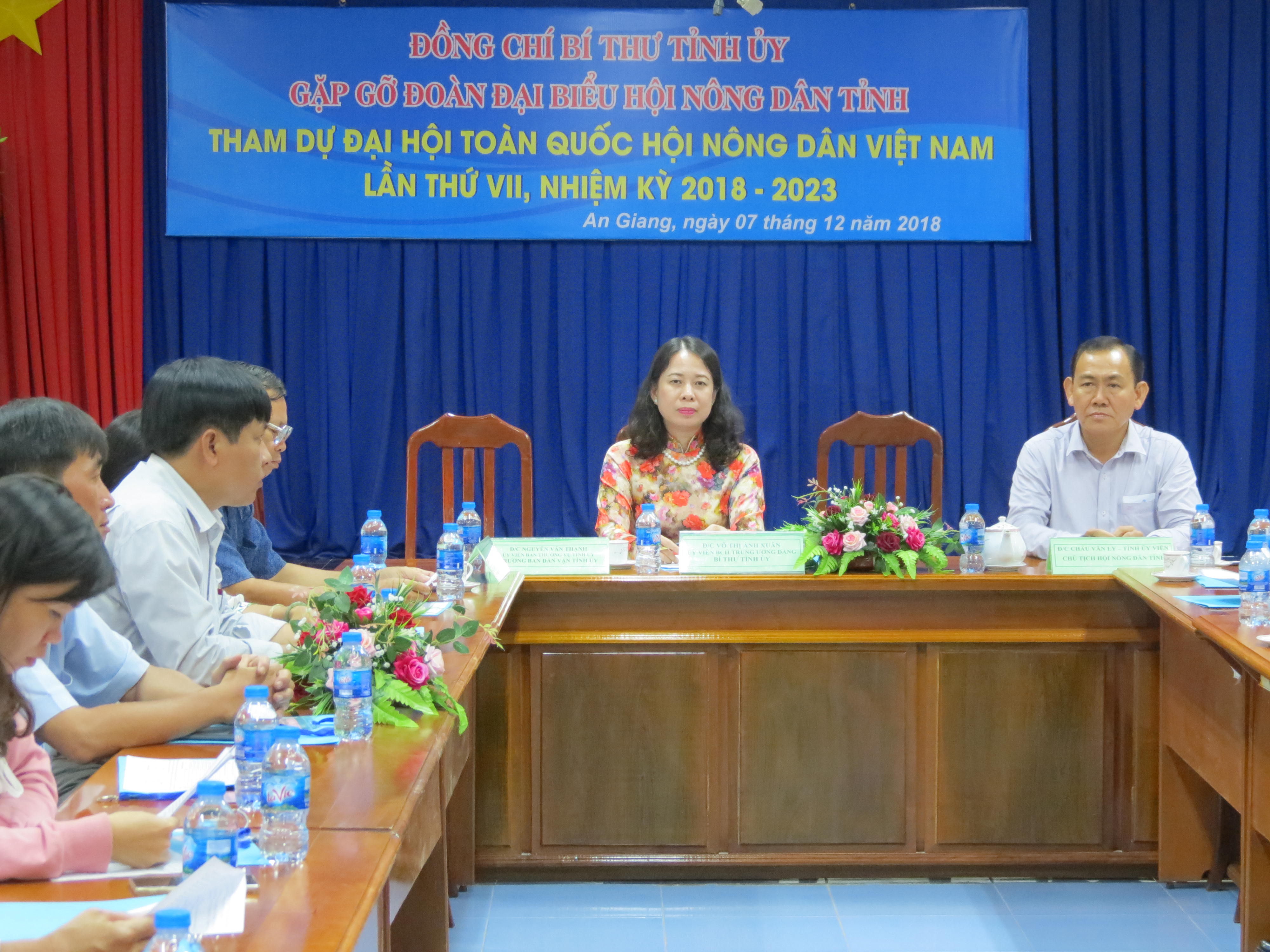 Bí thư Tỉnh ủy An Giang gặp gỡ đoàn Đại biểu Hội Nông dân tỉnh (10/12/2018 15:18) Bí thư Tỉnh ủy An Giang gặp gỡ đoàn Đại biểu Hội Nông dân tỉnh (10/12/2018 15:18)Vừa qua đồng chí Võ Thị Ánh Xuân, Ủy viên Ban Chấp hành Trung ương Đảng, Bí thư Tỉnh ủy An Giang gặp gỡ đoàn Đại biểu Hội Nông dân tỉnh An Giang tham dự Đại hội đại biểu toàn quốc Hội Nông dân Việt Nam lần thứ VII, nhiệm kỳ 2018 – 2023.