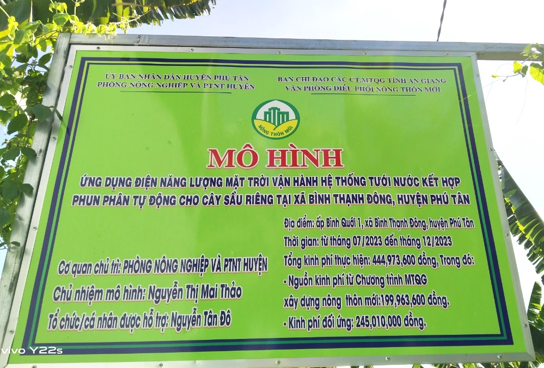 Hệ thống tưới năng lượng mặt trời - giải pháp mới cho sản xuất trong nông nghiệp. (18/06/2024 14:23) Hệ thống tưới năng lượng mặt trời - giải pháp mới cho sản xuất trong nông nghiệp. (18/06/2024 14:23)Thực hiện Nghị quyết 09 của Tỉnh Uỷ An Giang về phát triển nông nghiệp ứng dụng công nghệ cao tỉnh An Giang giai đoạn 2012 - 2020 và tầm nhìn đến năm 2030; Nghị quyết số 11 của Huyện Uỷ Phú Tân về chuyển đổi cây trồng.