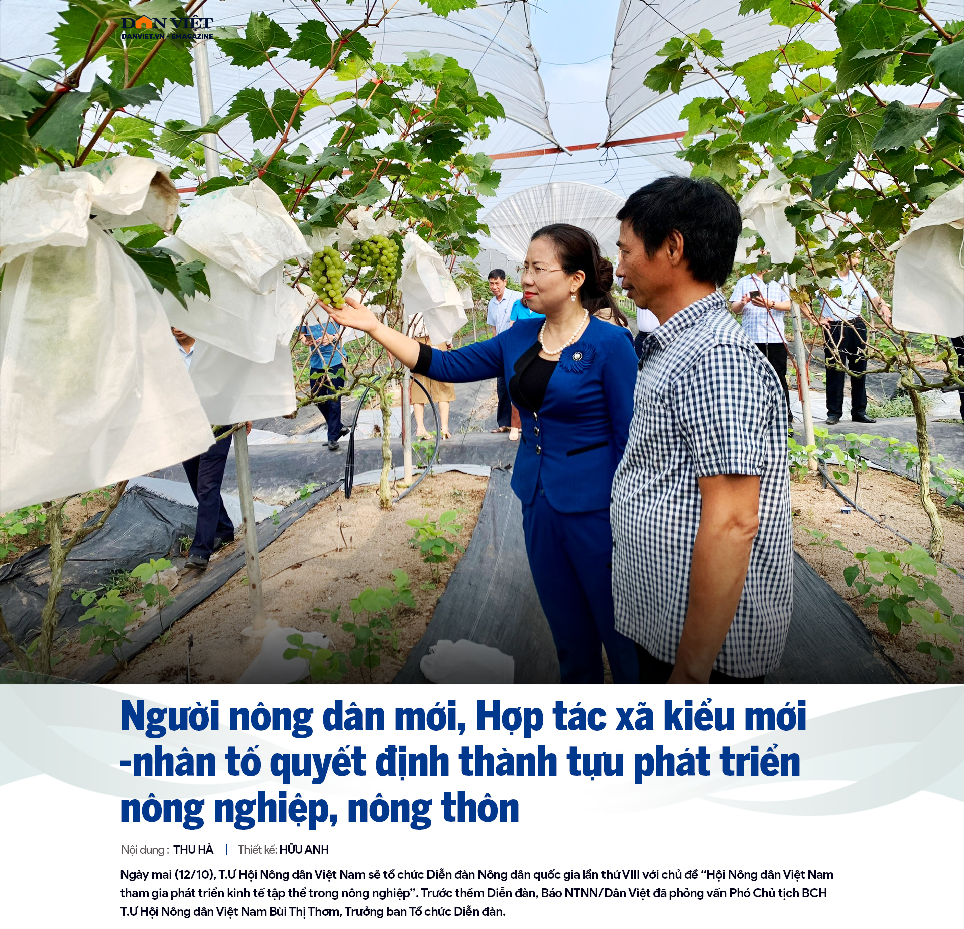 Người Nông dân mới, Hợp tác xã kiểu mới (11/10/2023 14:29) Người Nông dân mới, Hợp tác xã kiểu mới (11/10/2023 14:29)Phó Chủ tịch Ban Chấp hành Trung ương Hội Nông dân Việt Nam Bùi Thị Thơm khẳng định, văn kiện Đại hội XIII của Đảng định hướng rõ: "Đẩy mạnh cơ cấu lại nông nghiệp, phát triển kinh tế nông thôn gắn với xây dựng nông thôn mới, hướng tới mô hình nông nghiệp sinh thái, nông thôn hiện đại, nông dân văn minh…".
