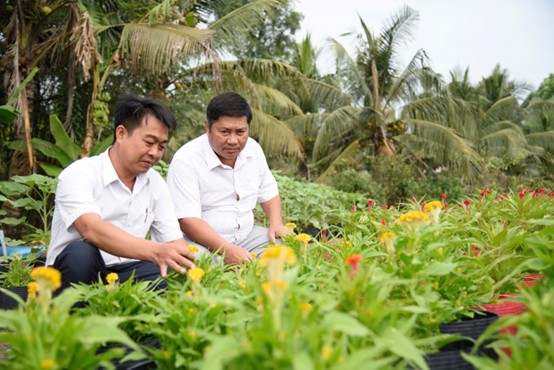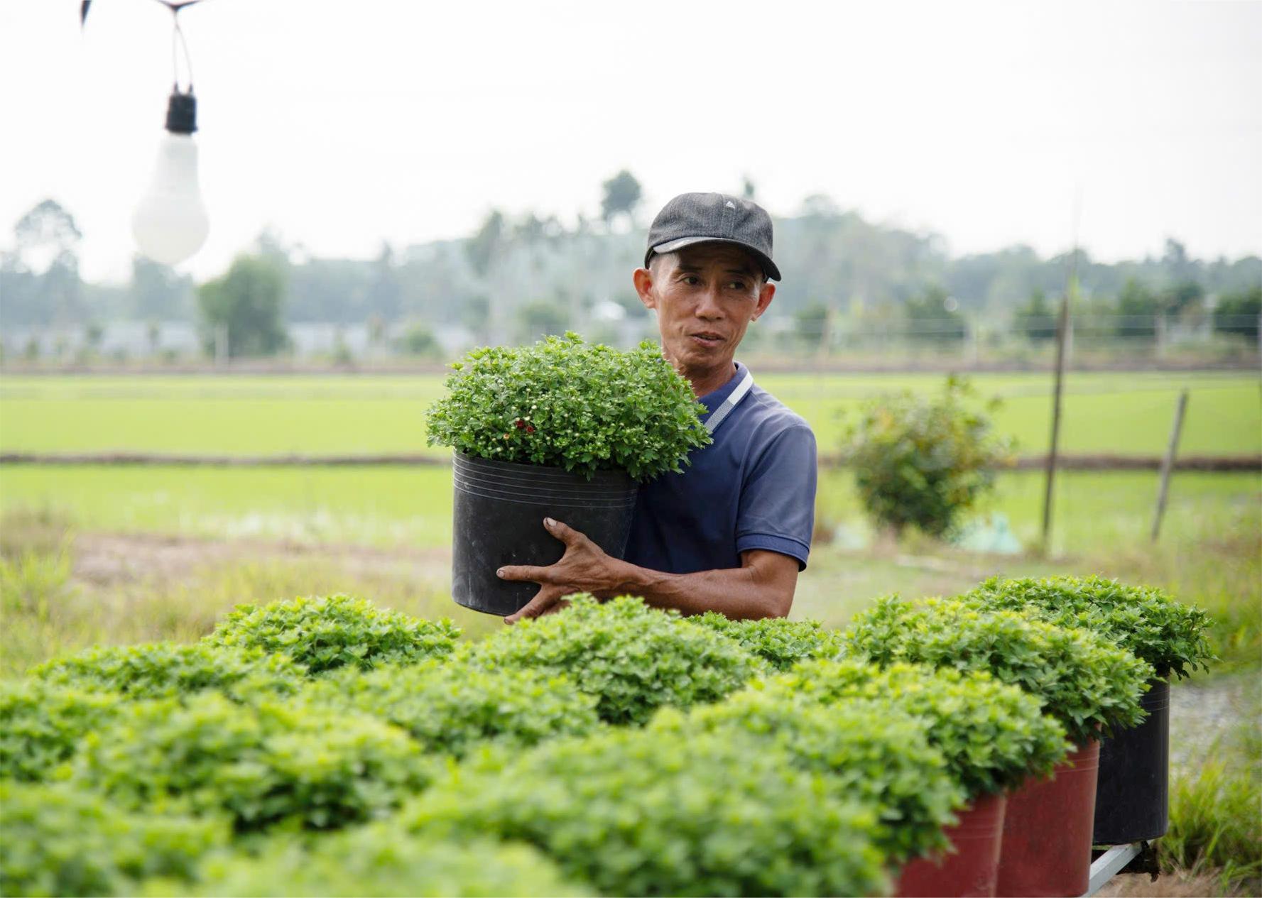 Tại ấp Ngã Con, xã Long Thạnh (tỉnh An Giang), vườn hoa của anh Đào Cảnh Bích những ngày này ngập tràn màu sắc. Hơn 5.000 chậu hoa các loại như cúc mâm xôi đỏ, cúc tím, hướng dương và vạn thọ được sắp xếp ngay ngắn, xanh tốt, chờ ngày xuất vườn. Nhìn từng chậu hoa bung nụ đều tăm tắp, anh Bích không giấu được niềm phấn khởi.