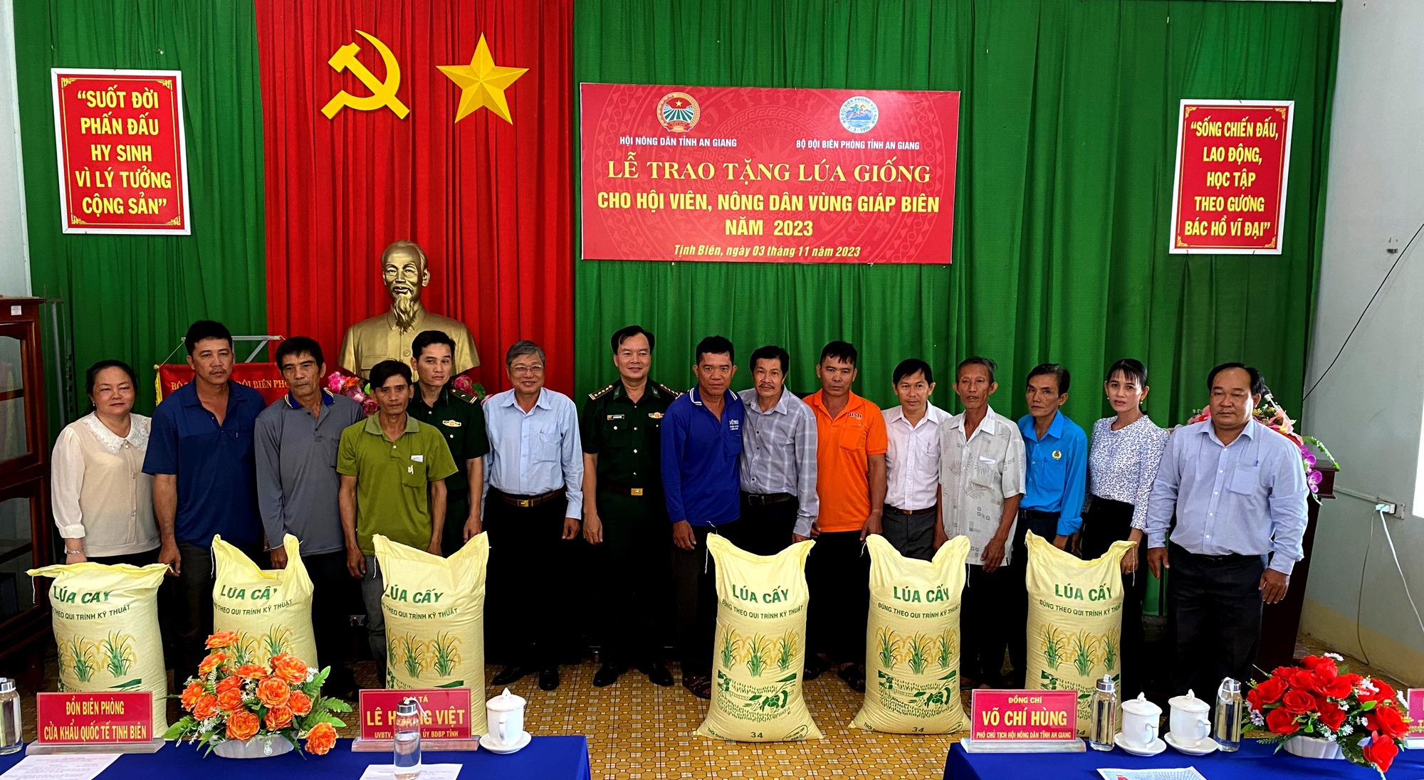 Trao tặng lúa giống cho hội viên nông dân vùng giáp biên. (03/11/2023 15:41)Sáng 3/11, tại Tịnh Biên, Hội Nông dân tỉnh An Giang phối hợp Bộ Chỉ huy Bộ đội Biên phòng An Giang và Đồn Biên phòng Cửa khẩu Quốc tế Tịnh Biên tổ chức lễ trao tặng lúa giống cho hội viên, nông dân vùng biên năm 2023.