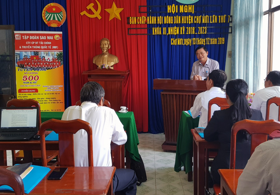 Chợ Mới tổng kết công tác Hội và phong trào nông dân (07/01/2020 15:58)Ngày 07/01/2019, Hội Nông dân huyện Chợ Mới đã tổ chức hội nghị tổng kết công tác hội và phong trào nông dân năm 2019, đề ra nhiệm vụ, phương hướng công tác Hội năm 2020.