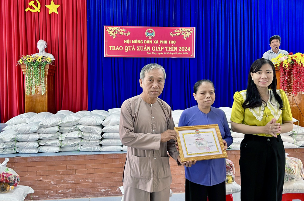 Hội Nông dân xã Phú Thọ vận động trao quà Tết Giáp Thìn 2024. (19/01/2024 14:51)Sáng ngày 19/01/2024 (nhằm mùng 9 tháng Chạp năm Quý Mão), Hội Nông dân xã Phú Thọ, huyện Phú Tân trao tặng 200 phần quà cho hội viên nông dân và bà con nghèo vui xuân đón tết no ấm đủ đầy.