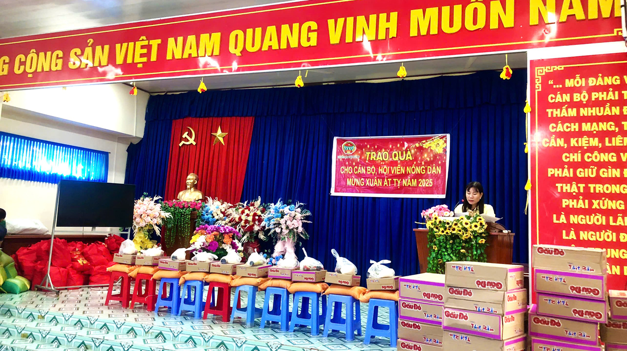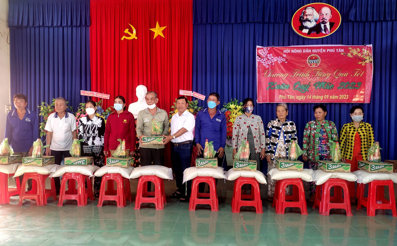 Hội Nông dân huyện Phú Tân tặng quà cho hội viên nông dân, hộ nghèo, hộ cận nghèo, hộ khó khăn. (14/01/2025 16:28) Hội Nông dân huyện Phú Tân tặng quà cho hội viên nông dân, hộ nghèo, hộ cận nghèo, hộ khó khăn. (14/01/2025 16:28)Nhằm góp phần thực hiện tốt công tác an sinh xã hội trên địa bàn huyện. Ngày 13/01/2025, tại hội trường UBND xã Tân Hòa và xã Phú Thạnh, Hội Nông dân huyện Phú Tân tổ chức Lễ trao quà Tết Mừng Xuân Ất Tỵ năm 2025.