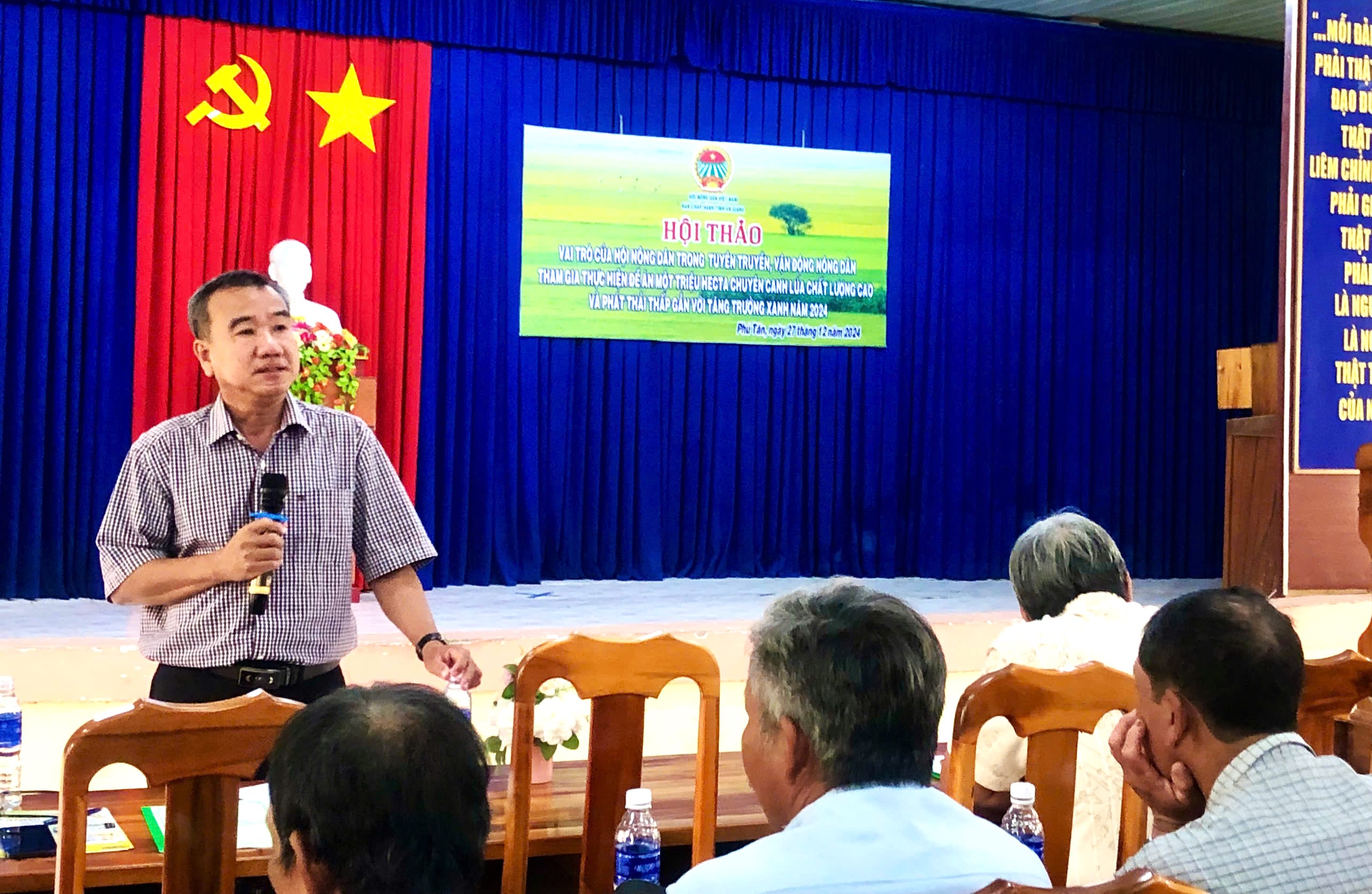 Hội thảo vai trò của Hội Nông dân trong tuyên truyền, vận động nông dân tham gia phát triển bền vững một triệu hec ta ... (27/12/2024 15:19) Hội thảo vai trò của Hội Nông dân trong tuyên truyền, vận động nông dân tham gia phát triển bền vững một triệu hec ta ... (27/12/2024 15:19)Sáng ngày 27/12, tại Phú Tân, Hội Nông dân (HND) tỉnh An Giang tổ chức Hội thảo vai trò của HND trong tuyên truyền, vận động nông dân tham gia phát triển bền vững một triệu hec ta chuyên canh lúa chất lượng cao và phát thải thấp gắn với tăng trưởng xanh năm 2024 cụm số 01 (gồm 02 huyện Phú Tân-Chợ Mới).