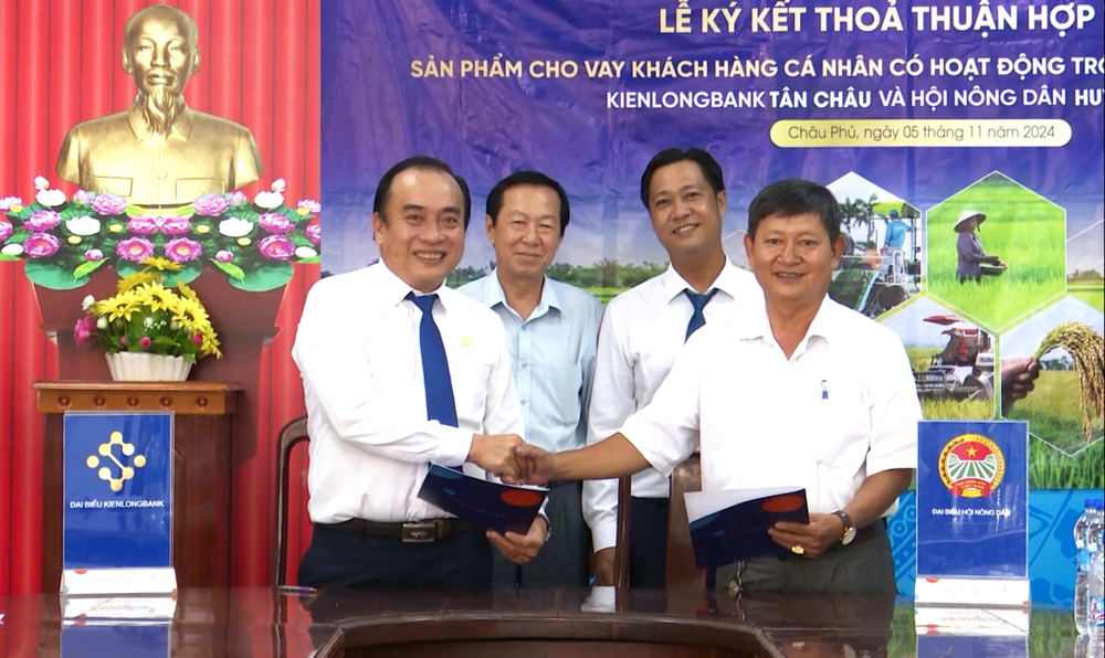 Hội Nông dân Châu Phú, Tri Tôn ký kết thỏa thuận hợp tác với Ngân hàng KienlongBank (07/11/2024 09:07) Hội Nông dân Châu Phú, Tri Tôn ký kết thỏa thuận hợp tác với Ngân hàng KienlongBank (07/11/2024 09:07)Thực hiện Thỏa thuận hợp tác số 01/2024 ngày 26/9/2024 về Thỏa thuận hợp tác giữa Hội Nông dân tỉnh An Giang và Ngân hàng Thương mại Cổ phần Kiên Long chi nhánh tỉnh An Giang (KienlongBank) về việc hỗ trợ vốn sản xuất kinh doanh đối với Khách hàng là Hội viên nông dân.