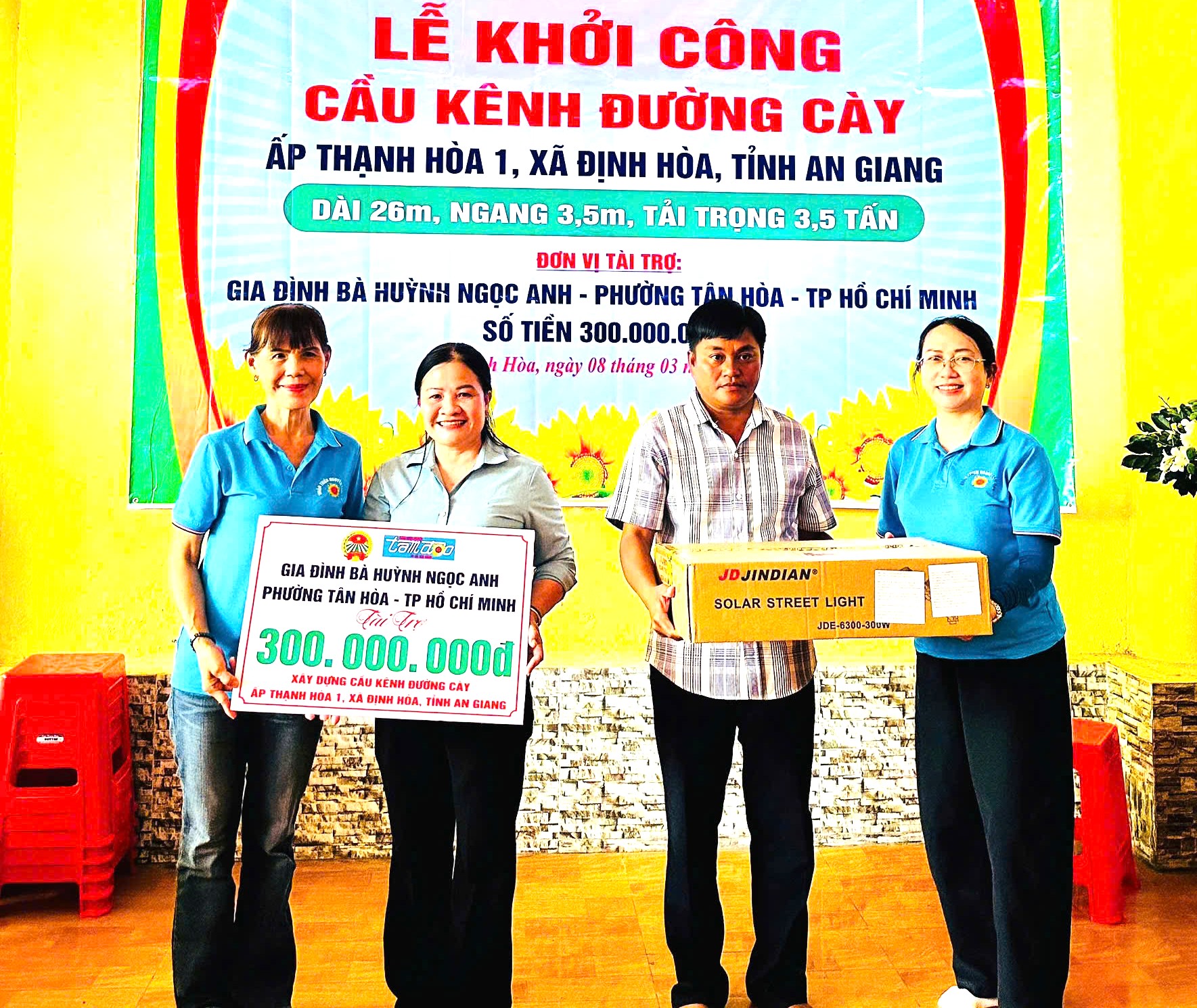 Cầu giao thông nông thôn Kênh Đường Cày có chiều dài 26m, ngang 3,5m, tải trọng 3,5 tấn, với tổng kinh phí dự toán khoảng 300 triệu đồng. Nguồn kinh phí xây dựng cầu do Hội Nông dân tỉnh An Giang, Nhóm Thiện nguyện Tâm Đạo TP. Hồ Chí Minh vận động gia đình bà Huỳnh Ngọc Anh (phường Tân Hòa, Thành phố Hồ Chí Minh) tài trợ.