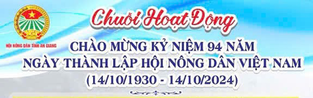 Chào mừng kỷ niệm 94 năm Ngày thành lập Hội Nông dân Việt Nam. (03/10/2024 14:04)Hội Nông dân tỉnh An Giang tổ chức chuỗi hoạt động kỷ niệm 94 năm Ngày thành lập Hội Nông dân Việt Nam (14/10/1930 - 14/10/2024)