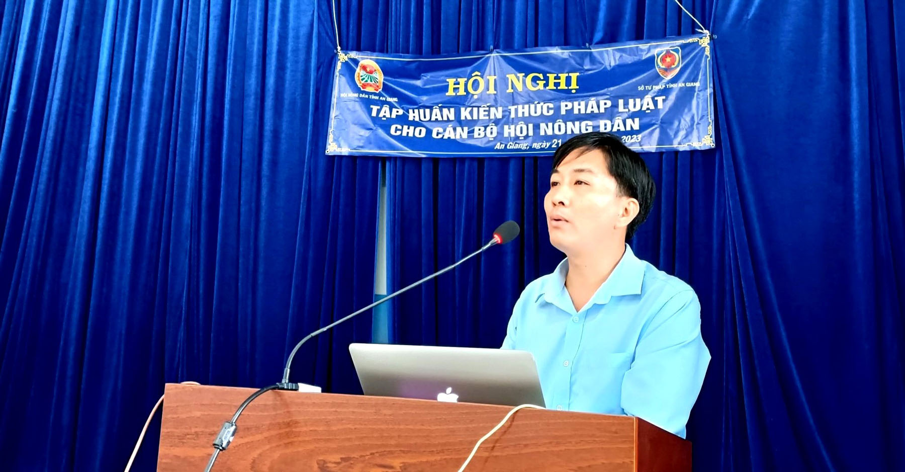 Châu Phú: Tuyên truyền, phổ biến giáo dục pháp luật cho cán bộ, viên hội nông dân. (29/09/2023 08:17)Trước đó, tại Châu Phú, Sở Tư pháp tỉnh An Giang phối hợp cùng Hội Nông dân huyện Châu Phú tổ chức phổ biến giáo dục pháp luật cho cán bộ, hội viên nông dân. Đến dự có ông Huỳnh Ngọc Vỵ - Chủ tịch hội Nông dân huyện Châu Phú.