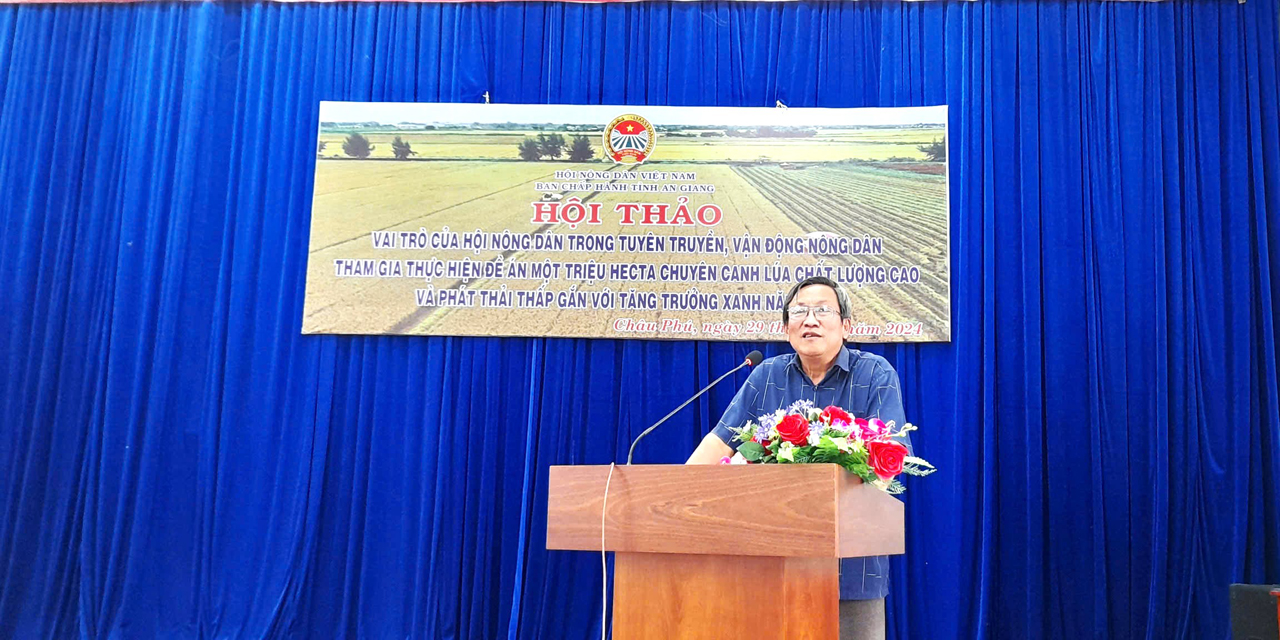 Hội thảo tuyên truyền nông dân tham gia đề án chuyên canh cây lúa chất lượng cao và phát thải thấp gắn với tăng trưởng xanh năm 2024. (30/12/2024 08:33)Ngày 29/12, tại huyện Châu Phú,Hội Nông dân tỉnh An Giang tổ chức Hội thảo về vai trò của Hội Nông dân trong tuyên truyền, vận động nông dân tham gia thực hiện Đề án 1 triệu héc-ta chuyên canh lúa chất lượng cao và phát thải thấp gắn với tăng trưởng xanh năm 2024.