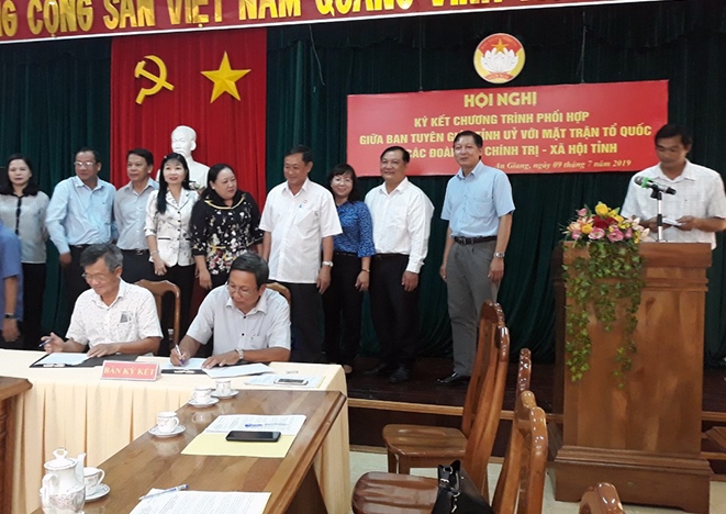 Chương trình phối hợp công tác với Ban Tuyên giáo Tỉnh ủy (10/07/2019 16:27)Ngày 09/7/2018 tại Hội trường Ủy ban Mặt trận Tổ quốc Việt Nam tỉnh An Giang đã diễn ra buổi lễ ký kết Chương trình phối hợp giữa Ban Tuyên giáo Tỉnh ủy với Ban Thường trực Ủy ban Mặt trận Tổ quốc Việt Nam tỉnh và các đoàn thể chính trị - xã hội tỉnh giai đoạn 2019 - 2024.