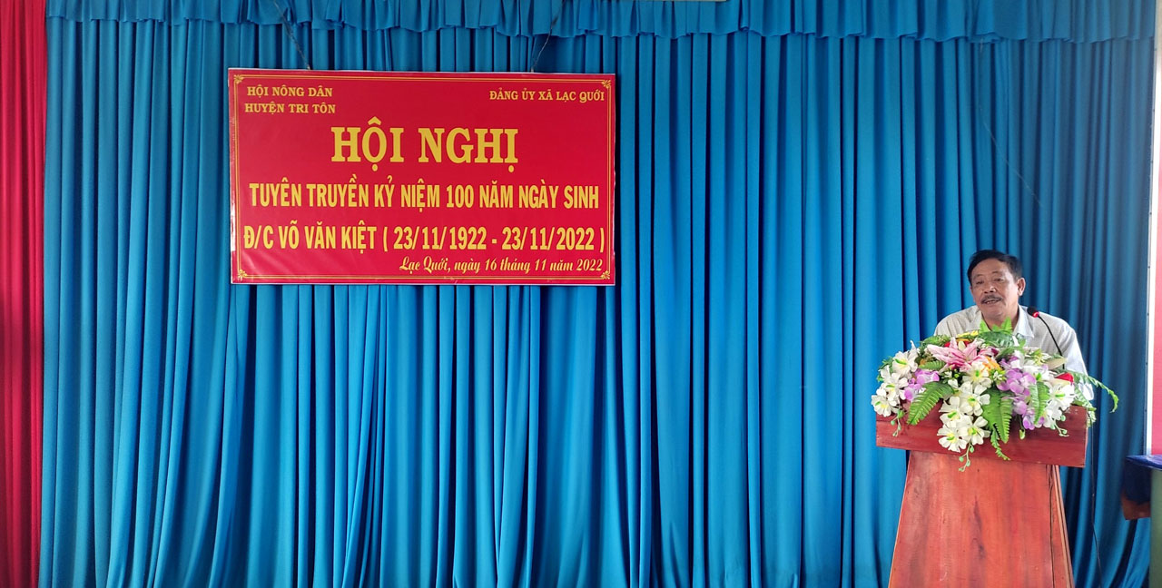 Tuyên truyền kỷ niệm 100 năm ngày sinh đồng chí Võ Văn Kiệt (17/11/2022 16:20)Ngày 16 tháng 11, Hội Nông dân huyện Tri Tôn, phối hợp cùng Đảng ủy xã Lạc Quới, tổ chức tuyên truyền kỷ niệm 100 năm ngày sinh đồng chí Võ Văn Kiệt (23/11/1922 - 23/11/2022). Nông dân 3 xã Vĩnh Gia, Vĩnh Phước, và Lạc Quới đến tham dự và lắng nghe.