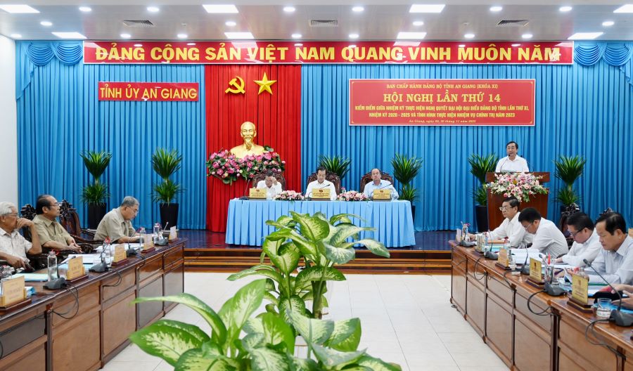 Sơ kết giữa nhiệm kỳ thực hiện Nghị quyết Đại hội Đảng bộ tỉnh An Giang lần thứ XI (29/11/2023 15:31)Sáng ngày 29/11, Ban Thường vụ Tỉnh ủy An Giang tổ chức Hội nghị Ban Chấp hành Đảng bộ tỉnh An Giang lần thứ 14 để sơ kết, đánh giá giữa nhiệm kỳ thực hiện Nghị quyết Đại hội Đảng bộ tỉnh lần thứ XI, nhiệm kỳ 2020 - 2025; tình hình thực hiện nhiệm vụ chính trị năm 2023, đề ra phương hướng, nhiệm vụ năm 2024; đồng thời quyết định một số chủ trương quan trọng khác.