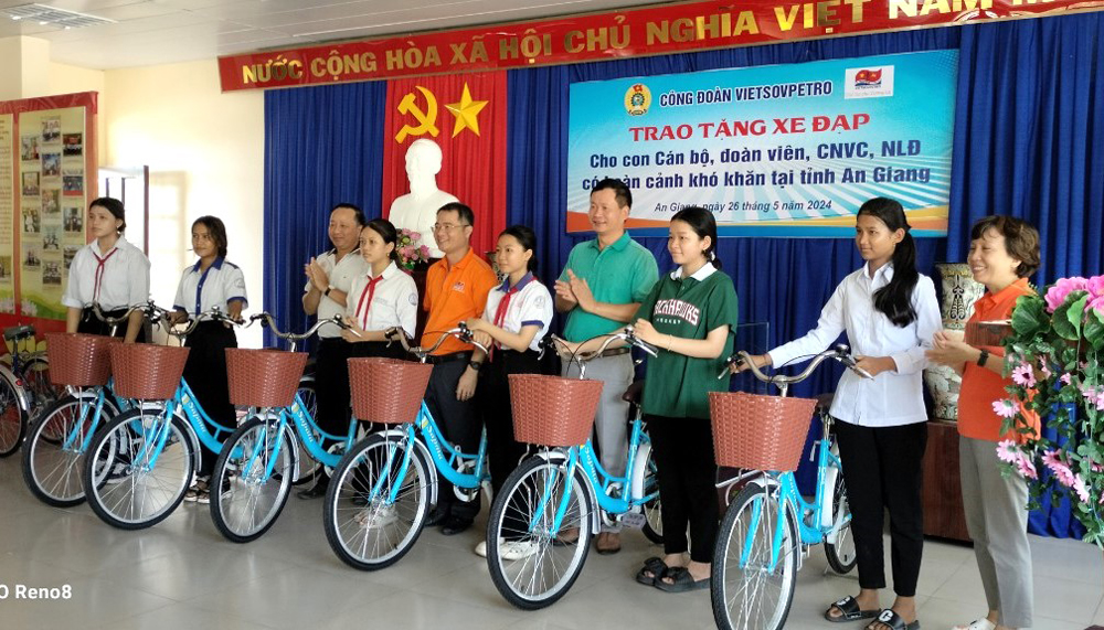Trao tặng xe đạp cho các cháu học sinh có hoàn cảnh khó khăn trên địa bàn Tỉnh An Giang. (27/05/2024 09:34)Sáng ngày 26/5, tại Khu du lịch Bác Tôn Mỹ Hòa Hưng - TP. Long Xuyên Công đoàn Liên doanh Việt - Nga Vietsovpetro phối hợp với Công đoàn Viên chức tỉnh tổ chức trao tặng 12 chiếc xe đạp cho các cháu học sinh có hoàn cảnh khó khăn vươn lên trong học tập.