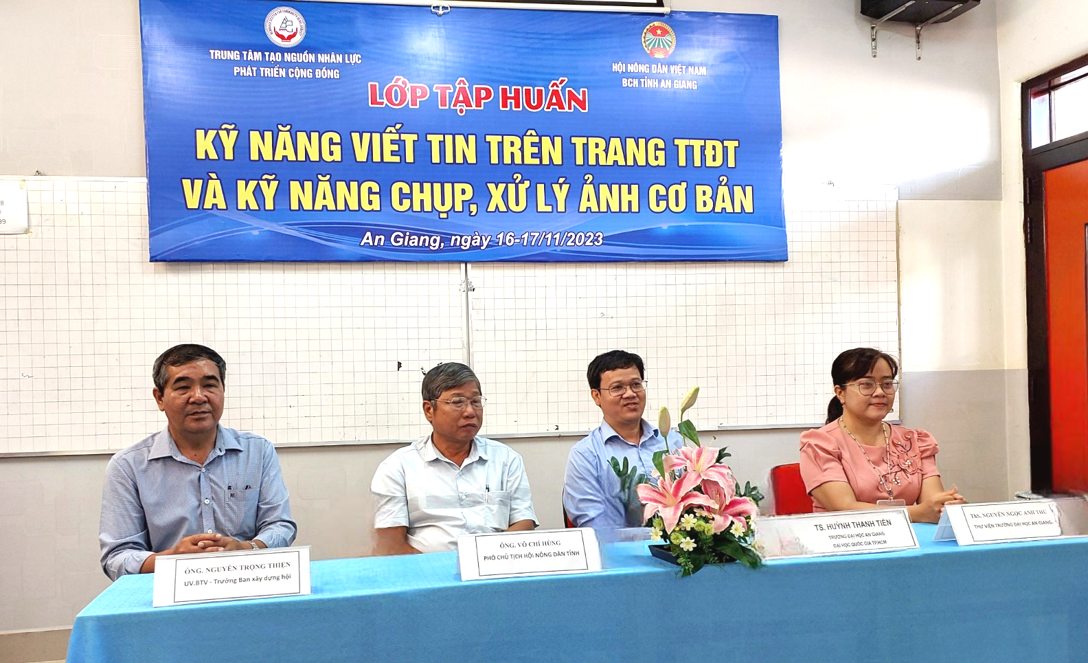 Tập huấn kỹ năng viết tin, bài và kỹ năng chụp, xử lý ảnh cơ bản (16/11/2023 13:53)Trong 2 ngày 16-17/11/2023, Ban Thường vụ Hội Nông dân tỉnh phối hợp với Trung tâm Tạo nguồn Nhân lực Phát triển Cộng đồng - Trường Đại học An Giang tổ chức lớp tập huấn kỹ năng viết tin, bài và kỹ năng chụp, xử lý ảnh cơ bản.