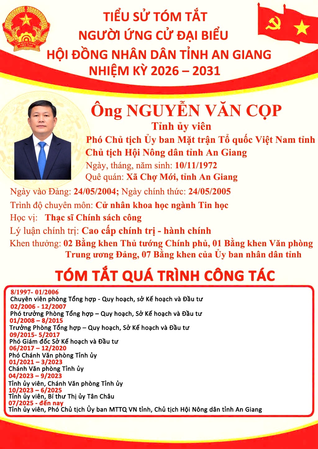 Tiểu sử tóm tắt Ông Nguyễn Văn Cọp, ứng cử Đại biểu Hội đồng Nhân dân tỉnh An Giang nhiệm kỳ 2026 - 2031.